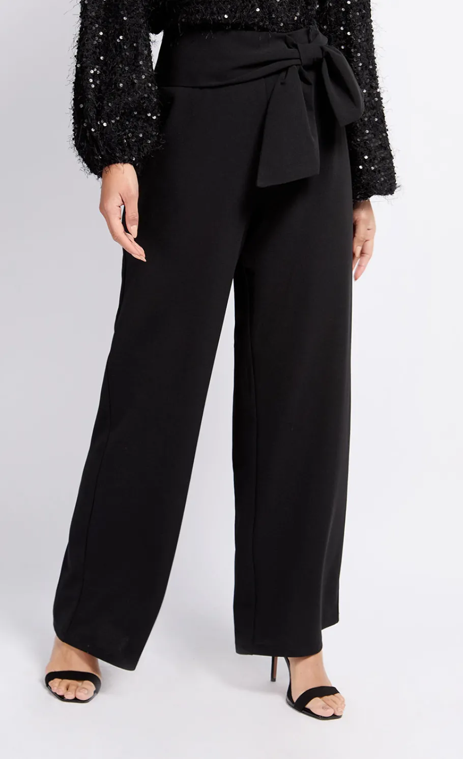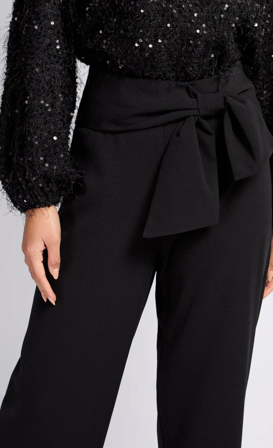 Introducing our Black Trousers with Bow Detail Waist Belt, a sophisticated addition to your wardrobe. These tailored trousers feature a stylish bow detail at the waist, adding a touch of elegance to your outfit. The classic black hue ensures versatility, perfect for both formal and casual settings. Crafted for comfort and style, they offer a flattering fit with a tapered leg silhouette. Pair them effortlessly with blouses or sweaters for a polished look that transitions seamlessly from day to night.