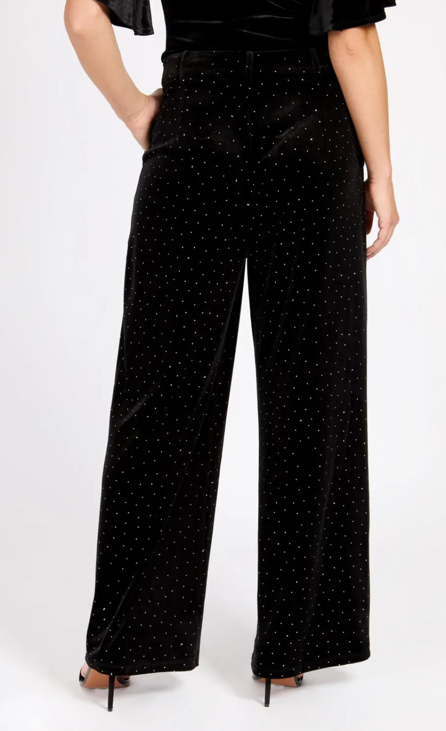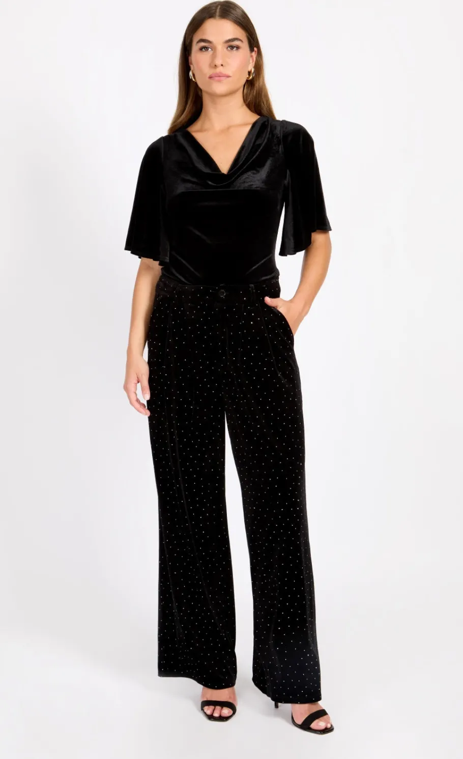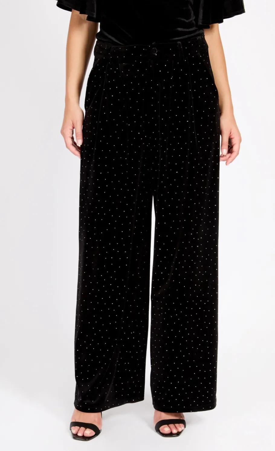 Introducing our Black Velvet and Silver Diamante Trousers, a blend of opulence and contemporary style. These trousers feature luxurious black velvet embellished with shimmering silver diamante details, adding a touch of sparkle to your wardrobe, perfect for the festive season! Co-ord blazer also available.